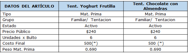 2. Complete los campos de cada artículo, con la información detallada en el siguiente cuadro.