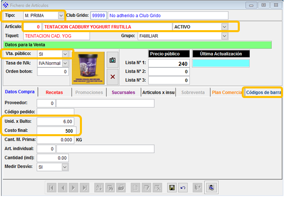 La carga del Nuevo Artículo debe verse del siguiente modo en su Fichero de Artículos: