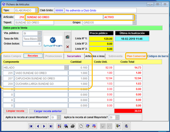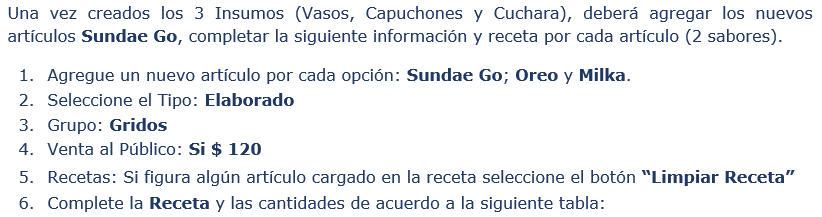 Así deberá verse en su Fichero de Artículos cada uno de los 2 sabores de Sundae Go:
